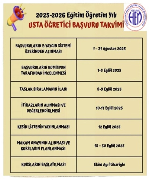 2025-2026 Eğitim Öğretim yılı usta öğretici başvuruları 1 Ağustos - 31 Ağustos tarihleri arasında e-yaygın sisteminde online olarak alınacaktır.